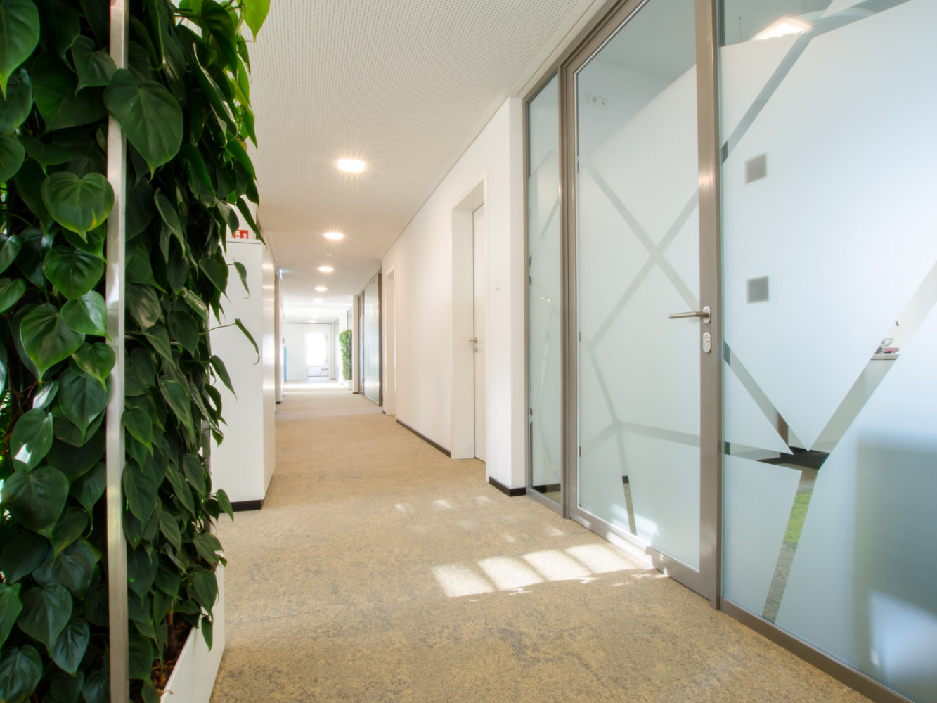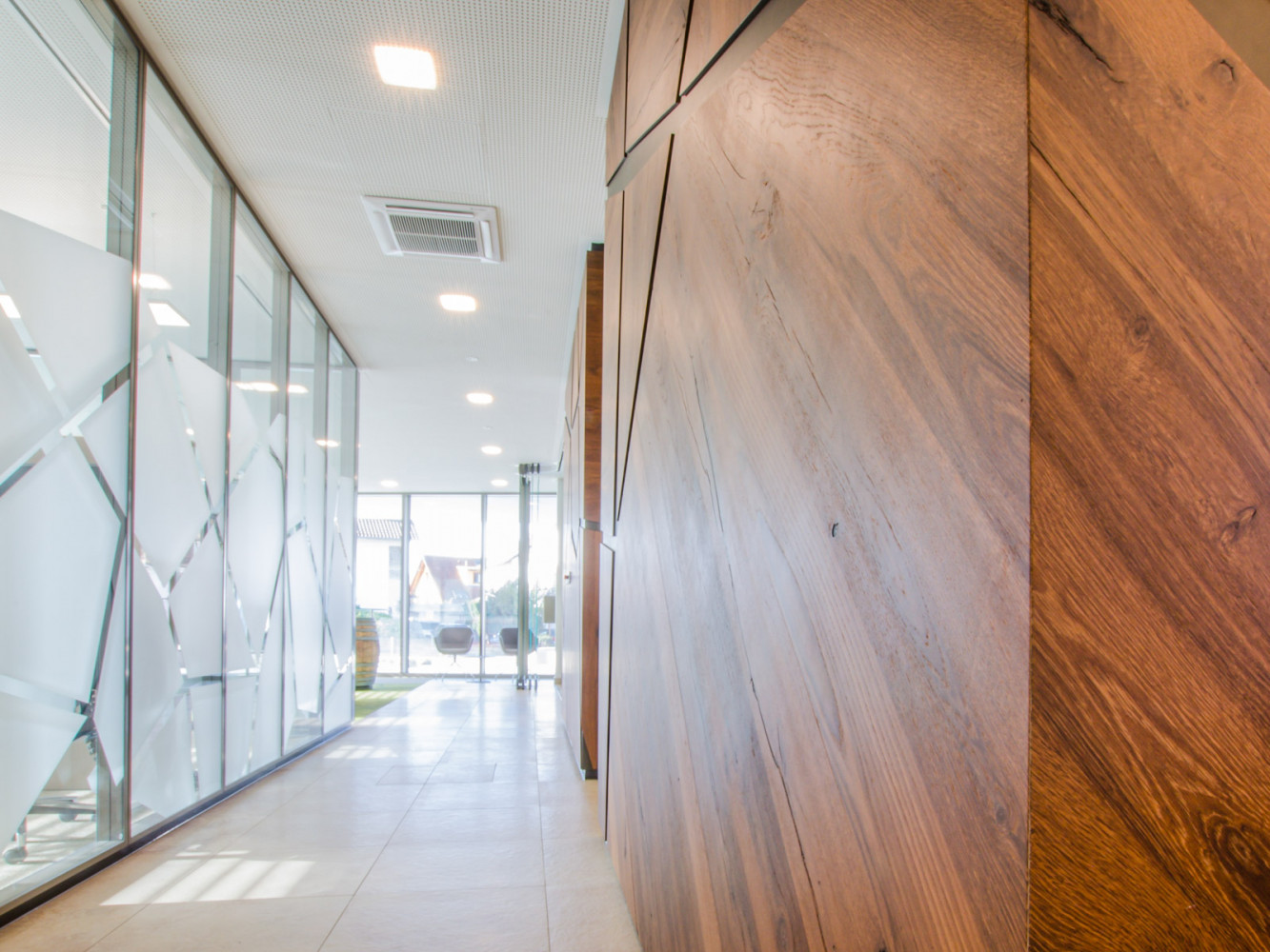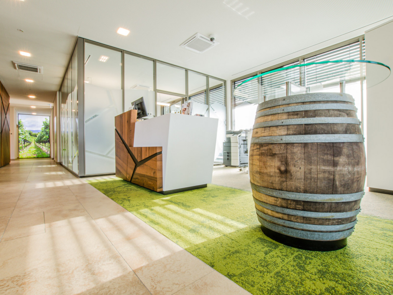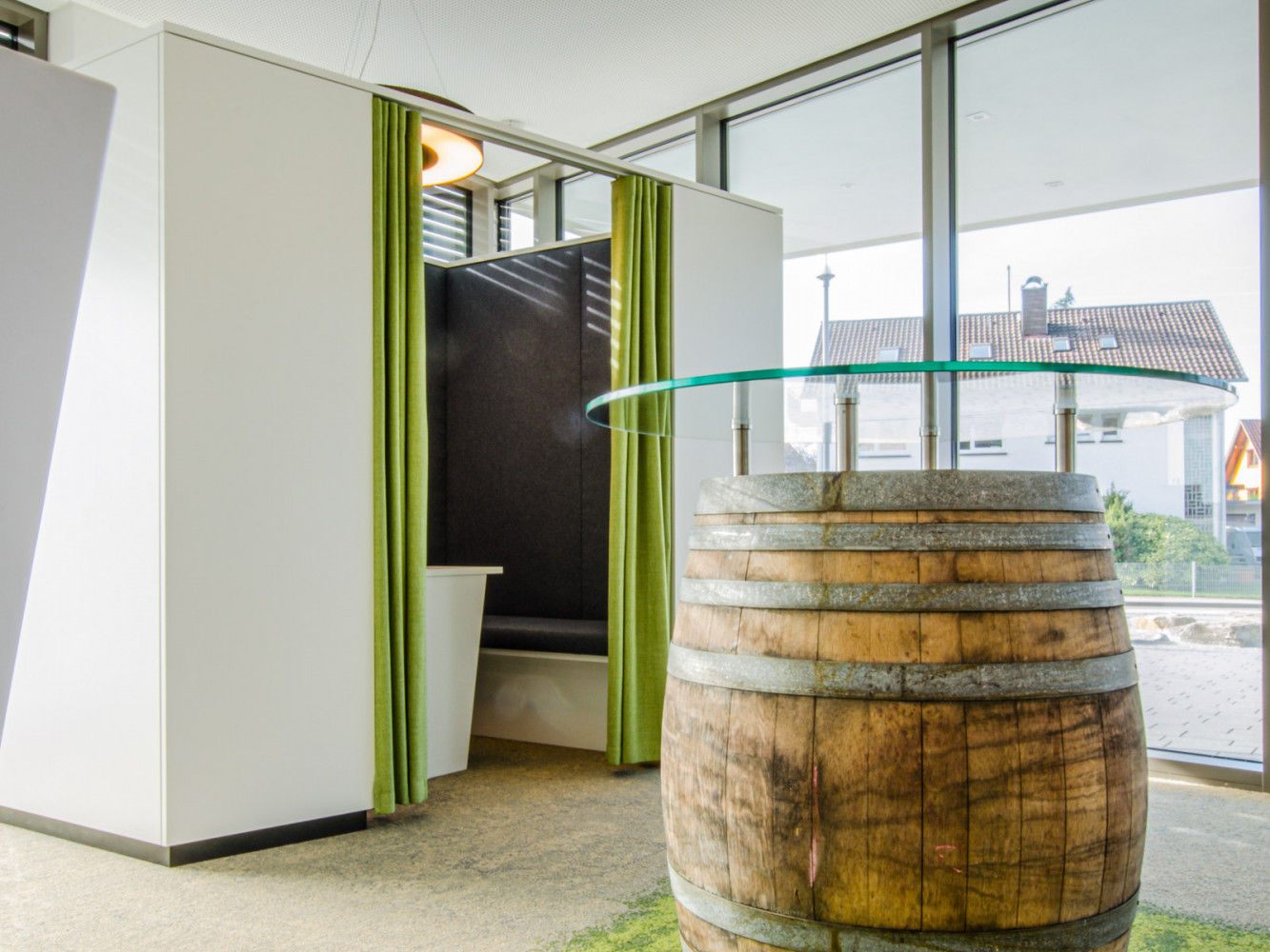 Mit dem Neubau in Denzlingen bekennt sich die Raiffeisenbank Denzlingen-Sexau klar zur Region. Die Verwaltung wurde zentralisiert, moderne Arbeitsplätze mit Wohlfühlzonen geschaffen. Architektonisch überzeugt das Gebäude mit Transparenz, regionalen Motiven und individuellen Gestaltungselementen – etwa einem beleuchteten Weinfass als Stehtisch. Die Glastrennwände bringen Licht bis in die Flure, bieten aber dank Folierung dennoch Diskretion. Auch technische Highlights wie die dreidimensional gestaltete SB-Wand unterstreichen die Liebe zum Detail.